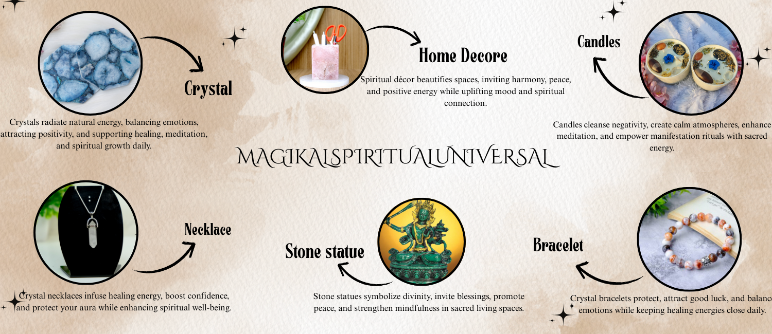 Our mission is to offer a diverse range of spiritual products and metaphysical services that inspire and enrich the lives of our clients. We believe in the power of universal spiritual energies, gifted by Mother Earth, to bring balance, healing, and positivity into daily life. Our doors are open to anyone looking to embark on their spiritual journey. With our products and services, we strive to provide the resources and guidance you need to find the perfect tools for fulfilling your desires.