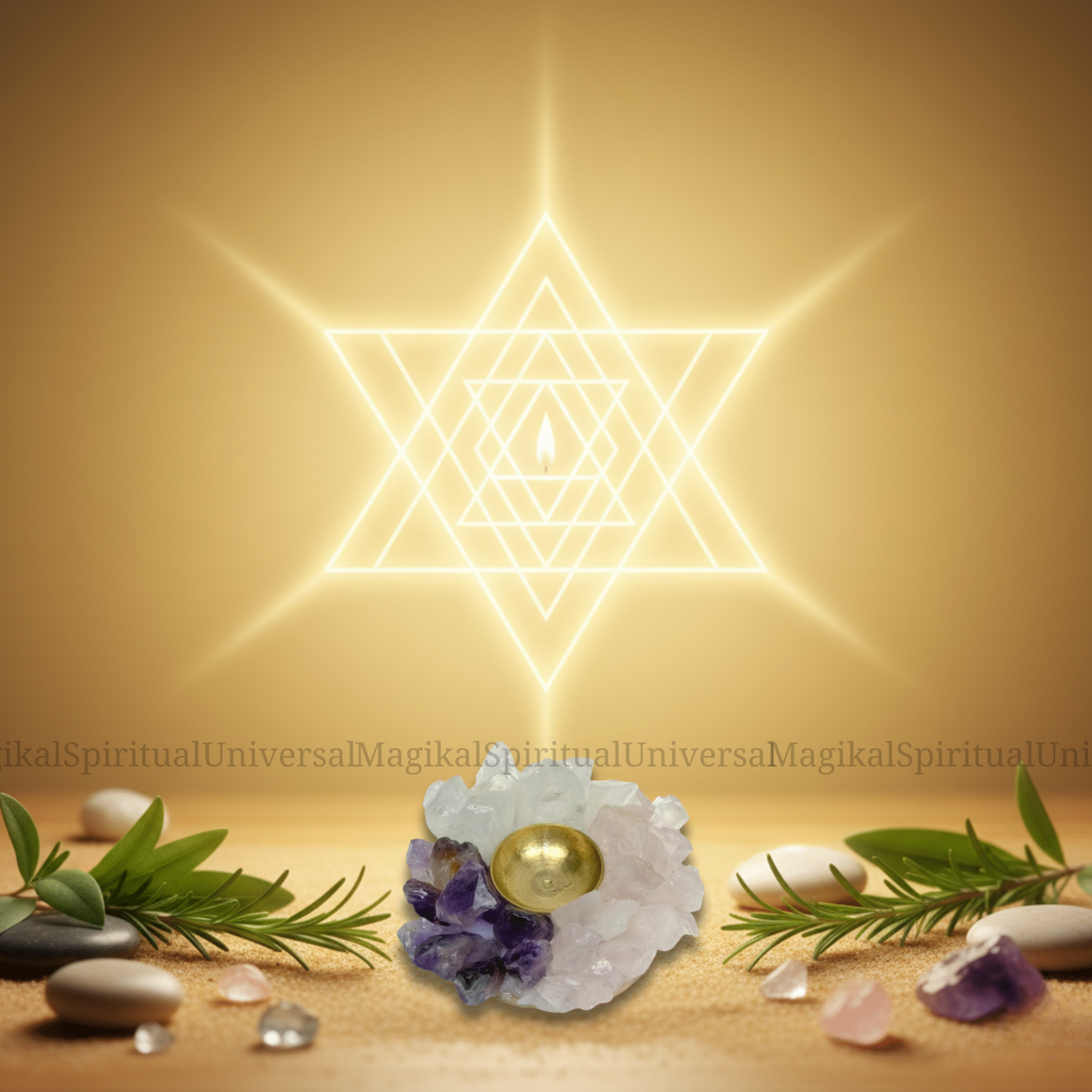 A beautiful, trio-crystal candle holder features a harmonious blend of raw Clear Quartz, Amethyst, and Rose Quartz chips cradling a flickering tealight. Set against a warm background beneath a glowing Sri Yantra symbol, this piece promotes spiritual balance, love, and clarity in any sacred space.