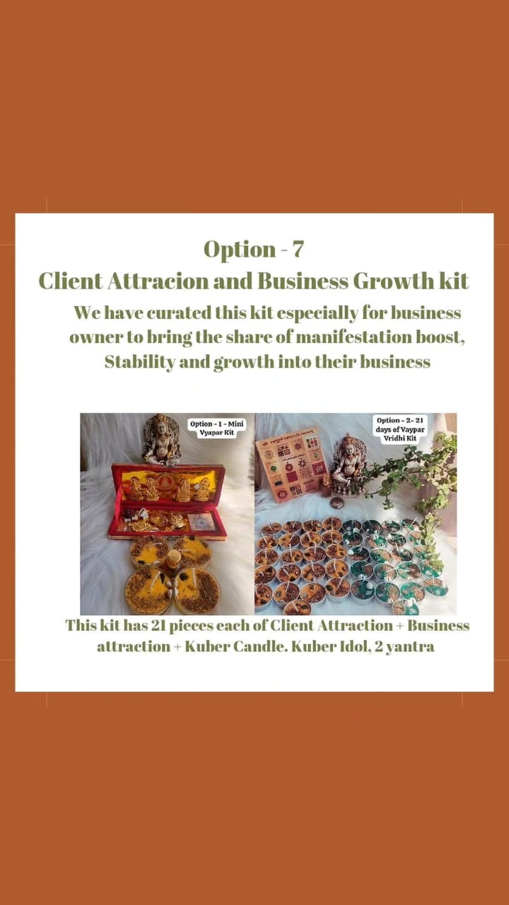 Brings manifestation boost, stability, and growth to business.Quantity21 pieces of sacred, energized items.Key ComponentsClient Attraction items to draw customers.Key ComponentsBusiness Attraction items for opportunities.Included DeitiesKuber Candle and Kuber Idol for wealth flow.Included Tools2 Yantras (sacred geometry) for powerful energy work.