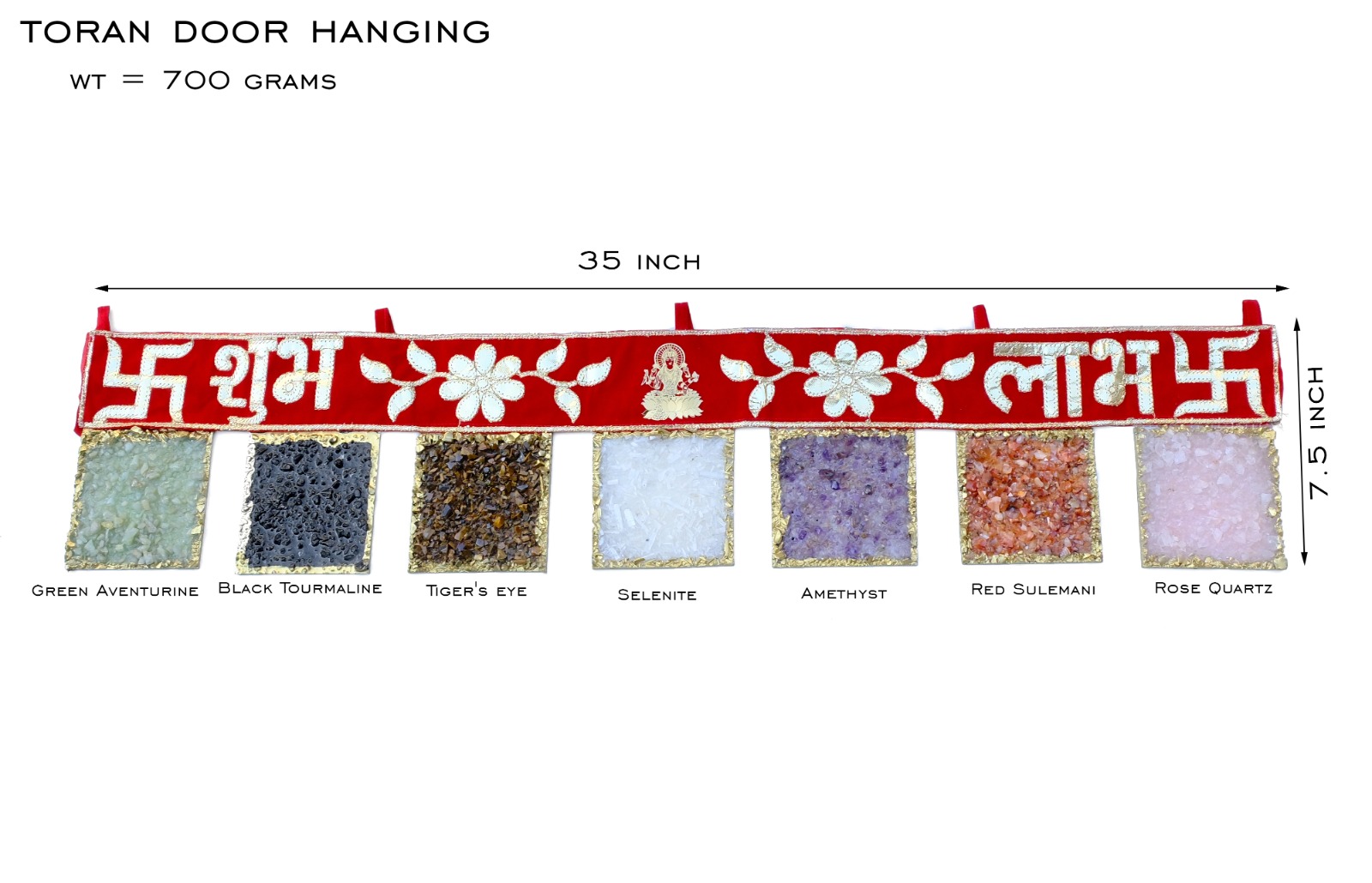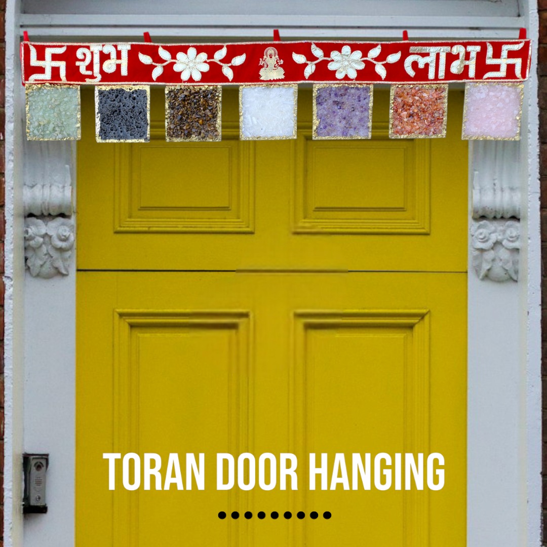 Welcome positivity, protection, and prosperity into your home with this stunning Crystal Toran Door Hanging. Crafted on a vibrant red velvet base with “Shubh” (Auspicious) and “Labh” (Prosperity) embroidered in shimmering white, this piece is adorned with 7 powerful natural healing crystals, each known for their unique metaphysical benefits.