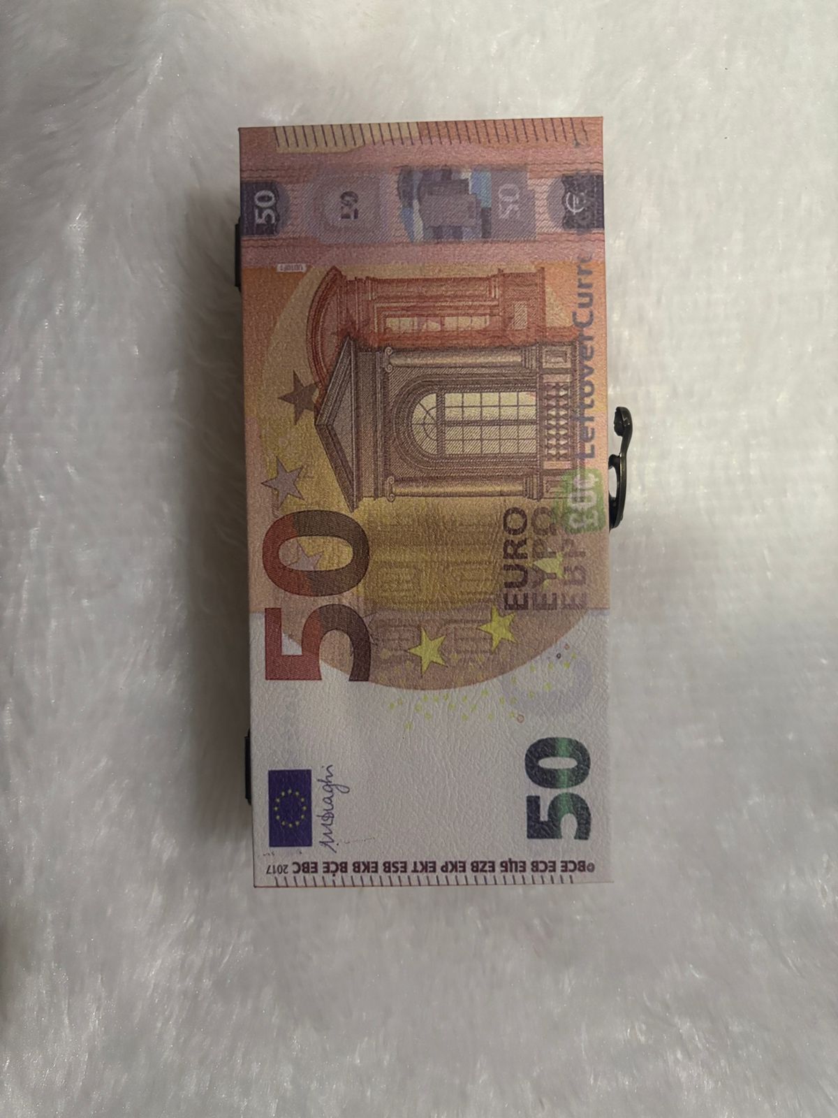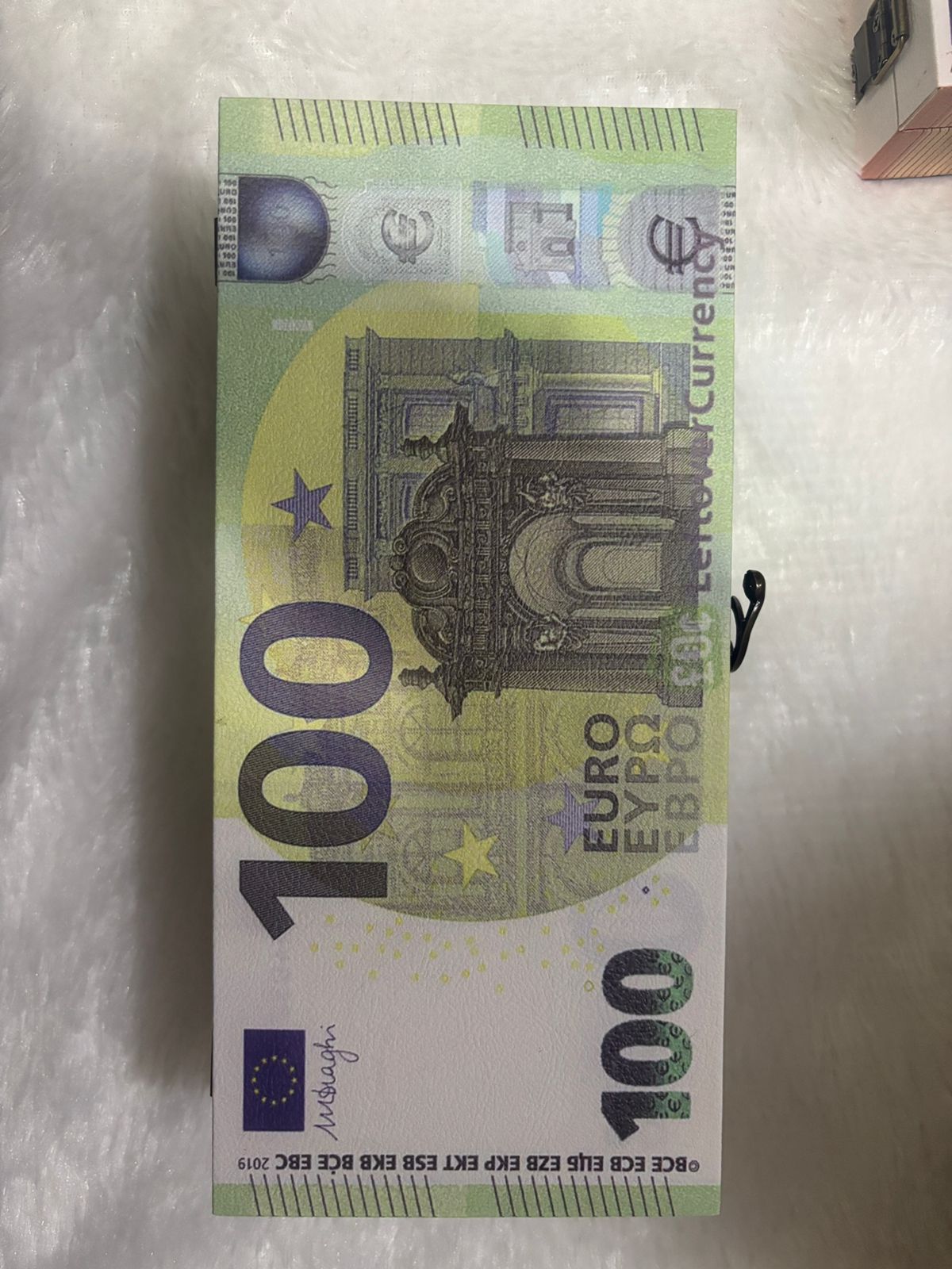 DesignHighly realistic printed replica of Euro banknotes (€100 and €50).FunctionDecorative and discreet storage box or small case.Aesthetic ValueAdds a luxurious, high-value aesthetic to any space.MaterialLikely wood or durable cardboard with a secure clasp.PurposeIdeal for storing small valuables, cash, or jewelry.AppealPerfect for financial manifestation rituals or a unique gift.