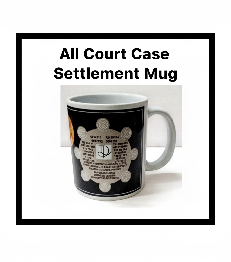 This product is a unique ceramic mug designed as a non-traditional aid for individuals seeking resolution and settlement in court cases. The mug features a high-contrast design with a black background and a central circular motif containing swirling spiral patterns.