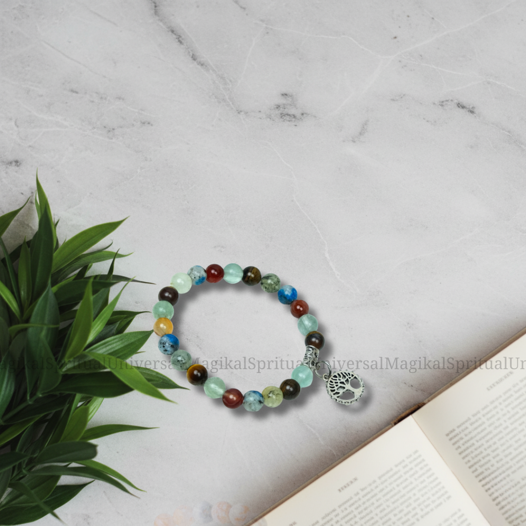 The bracelet primarily works on the solar plexus, heart, and root chakras, empowering confidence, strengthening decision-making, and grounding financial intentions. Its soothing greens promote emotional clarity, while the warmer tones ignite action and motivation—creating the perfect balance for releasing stuck or halted wealth.